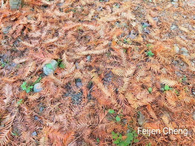 落了滿地的水杉葉子,手一摸葉片就掉落。