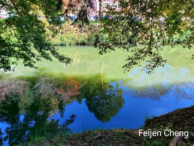 這一處能拍出最美、最夢幻的藍天、綠色山林、金黃水杉三色漸層水面倒影的最佳位置,卻因上頭的樹木陰影失色不少,乍看到照片若不知原因會覺得有點詭異。