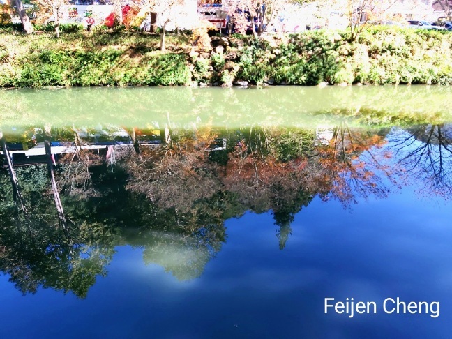 綠葉、楓紅映在水面上,虛與實交織成畫,宛若幻境。