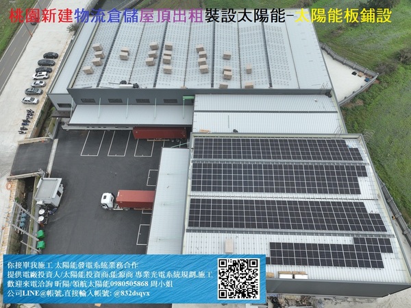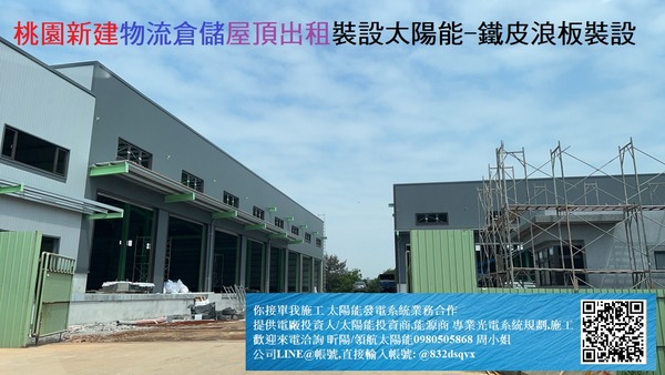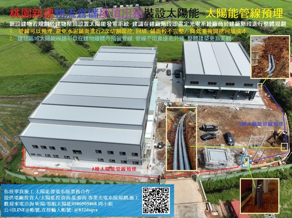 附件資料:新建廠房搭配施做太陽能光電系統 施工過程 桃園新建物流倉儲屋頂出租裝設太陽能- 1廠房整地階段 桃園新建物流倉儲屋頂出租裝設太陽能- 2廠房鋼構架設 桃園新建物流倉儲屋頂出租裝設太陽能- 3廠房鐵皮浪板裝設 桃園新建物流倉儲屋頂出租裝設太陽能- 4太陽能管線預埋 桃園新建物流倉儲屋頂出租裝設太陽能- 5.1太陽能支架架設 桃園新建物流倉儲屋頂出租裝設太陽能- 5.2太陽能支架架設 桃園新建物流倉儲屋頂出租裝設太陽能- 6太陽能板鋪設 桃園新建物流倉儲屋頂出租裝設太陽能- 7太陽能系統完工