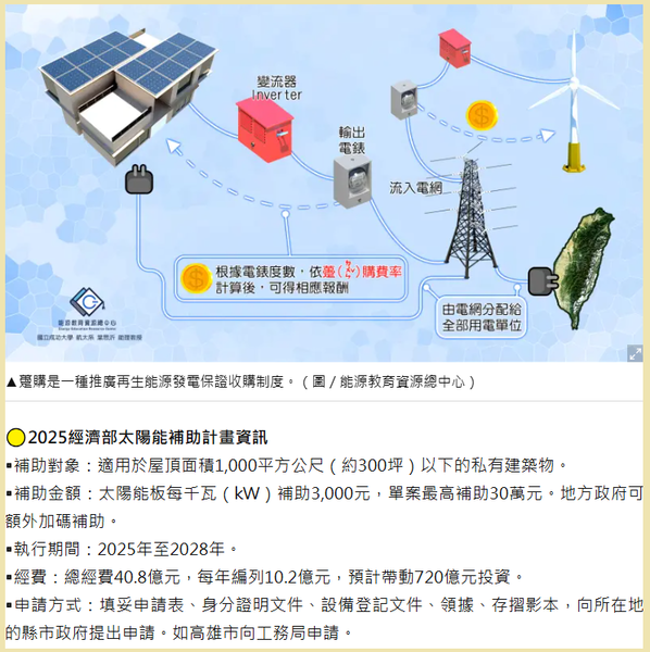 家裡有房子的人準備領錢了!為了達成「2050淨零排放」目標,經濟部推出「家戶屋頂太陽能補助計畫」,屋頂面積1000平方公尺(約300坪)以下的私有建築物,每千瓦(kW,瓩)可獲補助3,000元,單案最高30萬元,可疊加各縣市政府補助,還能將電回賣給台電,每年再賺好幾萬被動收入。據悉,台北大安區的信義新城社區靠屋頂光電年收百萬元。這項太陽能補助計畫執行期間為2025年到2028年,預估12萬戶受惠。 行政院指出,推動太陽光電是我國能源轉型的重點之一, 其中屋頂型太陽光電可廣泛結合設置於農業、工業、公有及民間屋頂,目前已完成 8.6GW,然而全台灣屋頂面積1,000平方公尺以下(302.5坪)的私有建築物設置比例只占了1成,極具推動潛力。 「家戶屋頂設置太陽光電加速計畫」(2025到2028)4年共將新增1.2GW屋頂型光電設置量,增加年發電量15億度電、帶動產業投資約720億元、推廣擴散12萬戶設置光電。 地球公民基金會過去曾揭露,台北大安區的「信義新城社區」在裝太陽能板前,20年來花了1000多萬處理屋頂漏水,後來社區主委推動屋頂設置太陽能板,10棟大樓144戶,屋頂裝457片太陽能板、面積約250坪,共147千瓦的光電板,每年可發出14到15萬度電,賣給台電年收90到100萬。 除了售電帶來收入,太陽能板設置費用7、8年就回本,也省去修屋頂漏水的費用,每年還能發給住戶1萬元紅包。更棒的是,屋頂光電的遮蔭也讓頂樓溫度下降5到8度,大大減少頂樓戶的冷氣使用量。 光電屋頂要花多少錢? 高雄工務局說明,以透天住宅屋頂設置6千瓦(kW)太陽光電板為例,裝置費用約6(kW)x70,000=42萬元,領取補助金額6(kW)x6,000(高雄補助6,000至12,000)=36,000元,每年售電收入約44,340元,預計回收年限為9~10年,剩下10~11年的發電為淨賺收入,相較無專業簽證之鐵棚違章,既保障結構安全又能賺綠金。 一般而言,每千瓦的太陽能發電系統每年能產生約1000~1200 度電,根據2023 年的「躉(ㄉㄨㄣˇ)購費率」(約4.4 元/度),每年可賣給台電約4400~5280 元的電費。 躉購(Feed-In Tariff, FIT)是一種推廣再生能源發電保證收購制度。與固定金額的補貼不同,躉購是由政府或台電公司以特定費率在特定年限收購所產生的電。目前躉購費率視裝置容量大小,分為政府規定及競標價兩種定價方式。 2025經濟部太陽能補助計畫資訊 補助對象:適用於屋頂面積1,000平方公尺(約300坪)以下的私有建築物。 補助金額:太陽能板每千瓦(kW)補助3,000元,單案最高補助30萬元。地方政府可額外加碼補助。 執行期間:2025年至2028年。 經費:總經費40.8億元,每年編列10.2億元,預計帶動720億元投資。 申請方式:填妥申請表、身分證明文件、設備登記文件、領據、存摺影本,向所在地的縣市政府提出申請。如高雄市向工務局申請。 資料來源:太陽光電單一服務窗口 https://www.nownews.com/news/6694299