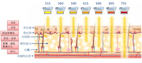 m22彩衝光可以依照每個人的皮膚狀況更換不同的濾片使用不同波長來做治療,量身訂作,主要用來治療色素斑點、膚色不均及微血管增生的皮膚,也可以用來除毛、緊實。
