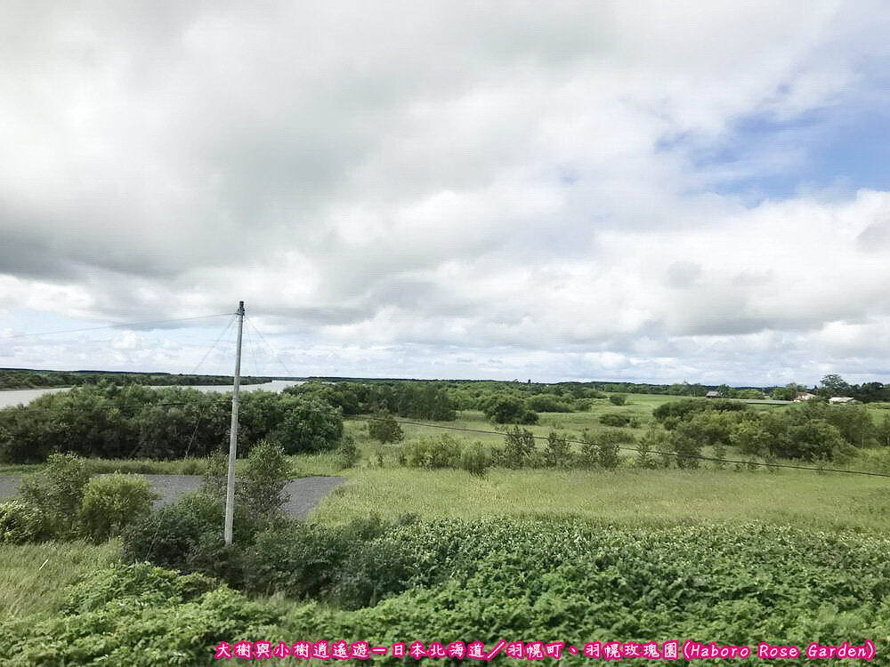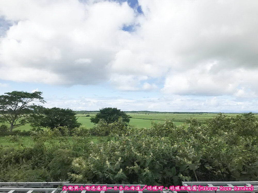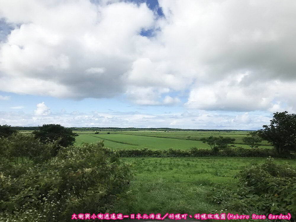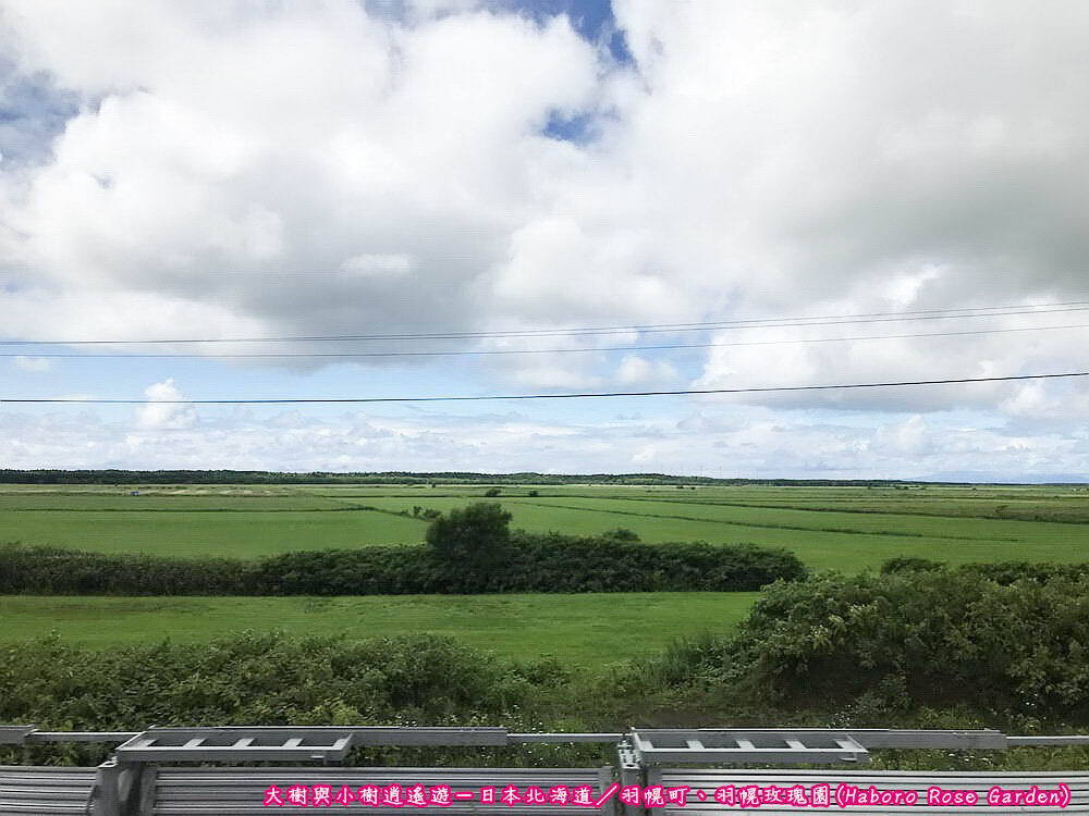 日本北海道-前往羽幌町途中再將目光移回車窗外的美景,此時天空已開啟藍天白雲模式,即使白雲仍佔據大範圍的天空,但漸漸散去的雲朵讓我們見到久違的藍天,配上沿途一望無際的綠地,簡直美得有如一幅畫。