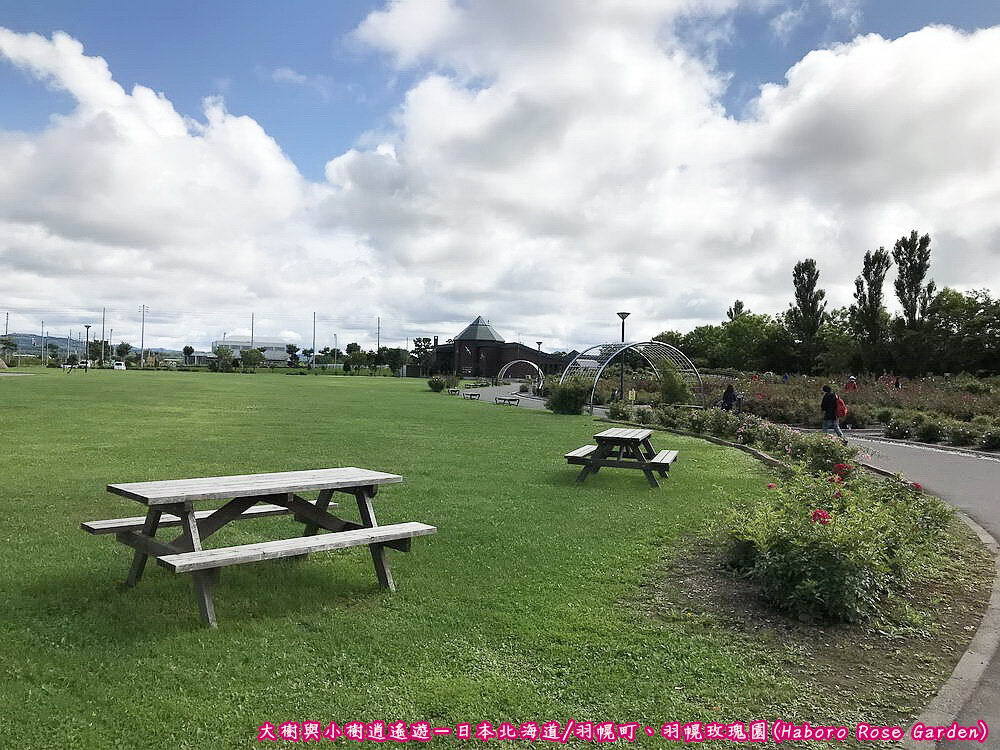 日本北海道-羽幌玫瑰園(Haboro Rose Garden)/園區一景大致介紹了幾種羽幌玫瑰園的玫瑰花,接下來再將目光移回上圖這片綠地,透過大面積的綠地視野,不難發現羽幌玫瑰園的佔地挺遼闊的,簡單的休憩區圖,讓公園與花兒各有一片揮灑的空間。