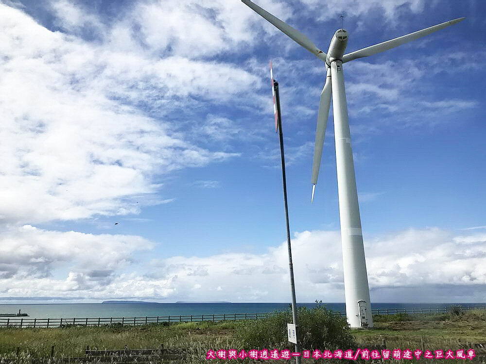 日本北海道-前往留萌途中/巨大風車鏡頭往下一挪,這個角度可以看見海,海邊的強勁風速正適合發展風力發電,與臺灣沿海一樣,這個風車設置的原理及目的正是風能,搭配藍天白雲及綠地景觀,巨大風車亦能美美入鏡,對吧!