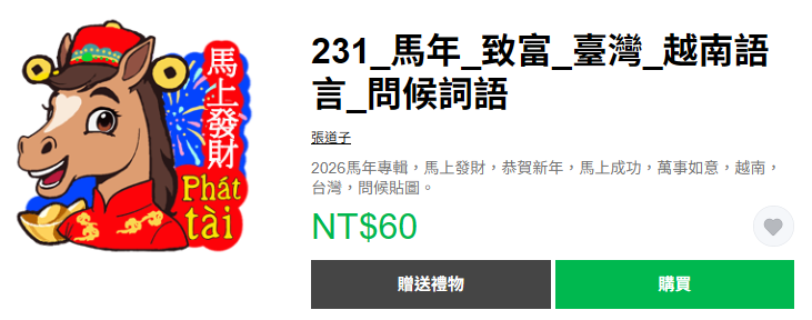 | 231_馬年_致富_臺灣_越南語言_問候詞語 231_馬年_致富_臺灣_越南語言_問候詞語 – LINE貼圖 | LINE STORE (網址位置) |