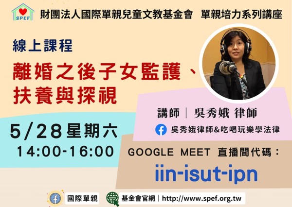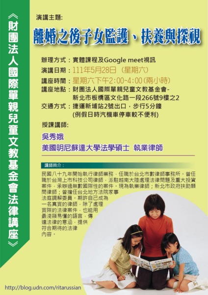 《財團法人國際單親兒童文教基金會法律講座》 1.辦理方式:實體課程及Google meet視訊 2.演講主題:離婚之後子女監護、扶養與探視 3.演講日期:111年5月28日(星期六) 4.講座時間:星期六下午2:00~4:00(兩小時) 5.講座地點:財團法人國際單親兒童文教基金會- 新北市板橋區文化路一段266號9樓之2 6.交通方式:捷運新埔站2號出口,步行5分鐘