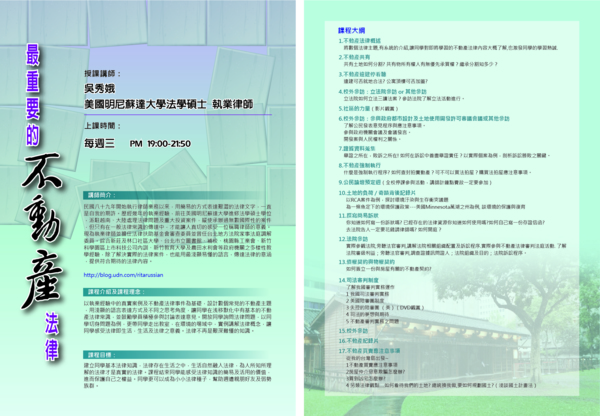將數個法律主題,有系統的介紹,讓同學對即將學習的不動產法律內容大概了解,也激發同學的學習熱誠.