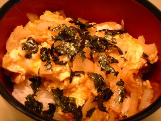 玉子丼:洋蔥半顆、青蔥一根、青菜少許(我放的是香菇和沙拉葉和一點青豆)、高湯1/2杯、白糖半匙。 作法: 將洋蔥切成細絲、青蔥切小段,將油鍋熱好後放入爆香,把蔬菜放進去,然後倒入1/4杯的高湯,轉至小火繼續加熱三分鐘,這時候可以準備蛋汁,將雞蛋打散放入1/4的高湯和一匙白糖伴勻,就可以把蛋汁倒進鍋中輕輕攪拌。蛋汁熟透後就可以起鍋蓋在飯上囉! 有個感想是突然很想念家鄉的宜蘭蔥,別得地方真得沒的比。 |