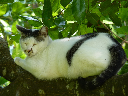 童年家中養狗 但從不曾養貓 狗忠實而顧家 所以從未中斷養狗 但是現在要我養貓狗 敬謝不敏 .......................................................... 社區公園的水黃皮樹上 兩隻貓慵懶地閉目養神 在炎夏掛著像錢幣的水黃皮樹上 ﹝所以水黃皮又稱為掛錢樹﹞ 有風輕輕吹拂著 難怪這貓要打盹 2011.08.23
