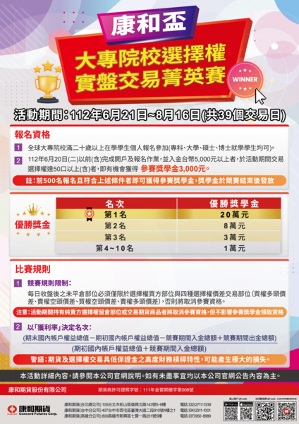 - 參與本交易競賽之學員必須年滿20歲,並應在112年6月20日以前(含)至康和期貨與康和證券各營業據點完成開戶、於活動網頁報名成功並入金至少台幣5,000元(入金金額無上限)。