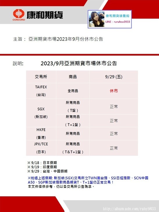 亞洲期貨市場9月份休市公告 9/29(五):台灣休市