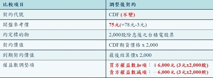 調整生效日前一營業日收盤留有部位者,於調整生效日開盤前調整買賣方權益數,原CDF買賣雙方權益不因開盤參考價下調至75元受影響