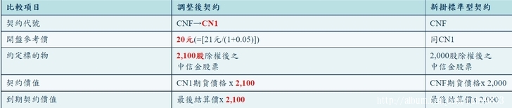 中信金期貨契約調整生效日為8/31 (即除權日),前一日中信金期貨9月份契約結算價為21元。