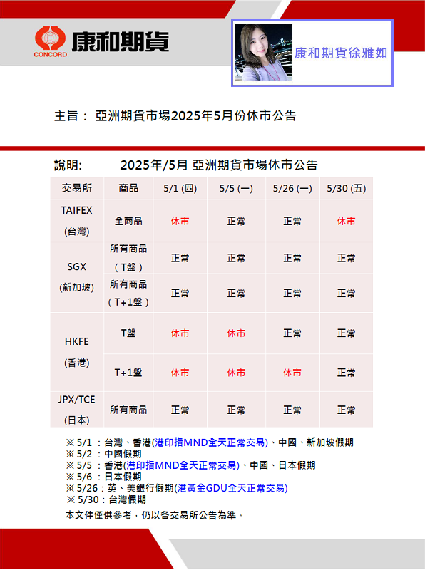 2025亞洲期貨市場5月份休市公告 5/1(四):台灣、香港休市 5/5(一):香港休市 5/26(一):香港T+1盤休市 5/30(五):台灣休市