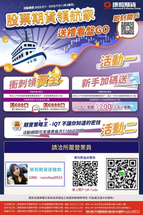資料來源: https://www.concordfutures.com.tw/Promote/2025-04-08-Instant%20Coupons/index01.html (註:依現況資訊不定時更新資料,仍以康和期貨官網公告為準) ----------------------------------------------
