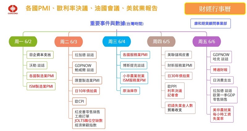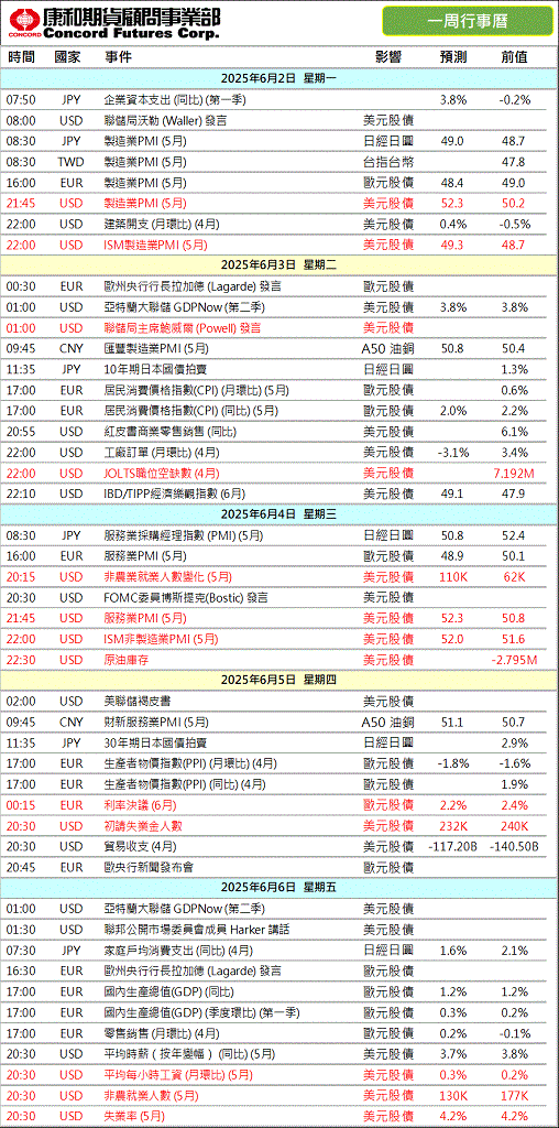 康和期貨-重要數據行事曆20250602 資料來源:https://www.concordfutures.com.tw/ConcordFutures/ (註:依現況資訊不定時更新資料,仍以各交易所公告為準) ----------------------------------------------