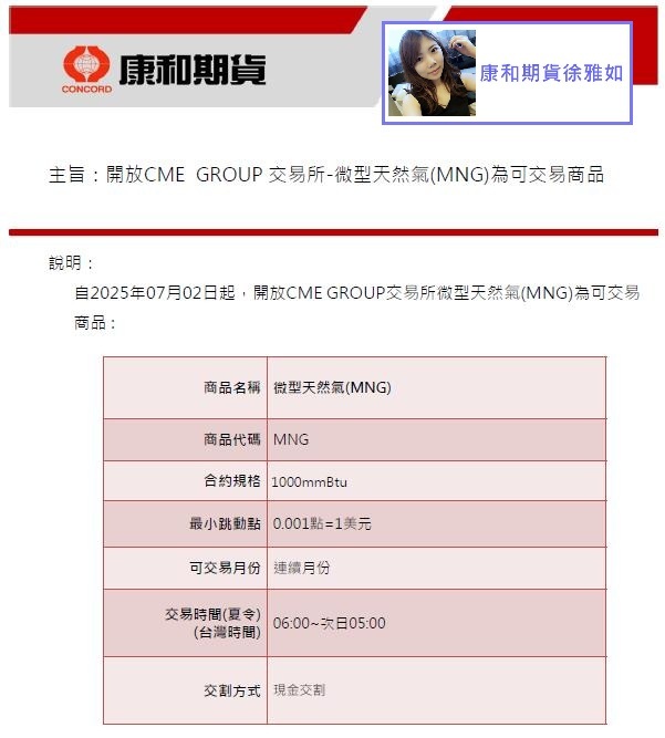 CMEGROUP交易所微型天然氣(MNG) 合約規格: 1000mmBtu 最小跳動點: 0.001點=1美元 交易月份: 連續月份 交易時間: (夏令) (台灣時間) 06:00~次日05:00 交割方式: 現金交割