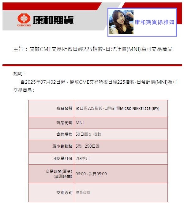 CMEGROUP交易所微型日經225指數-日幣計價(MNI) 合約規格: 50日圓 x 指數 最小跳動點: 5點=250日圓 交易月份: 2個季月 交易時間: (夏令) (台灣時間) 06:00~次日05:00 交割方式: 現金交割