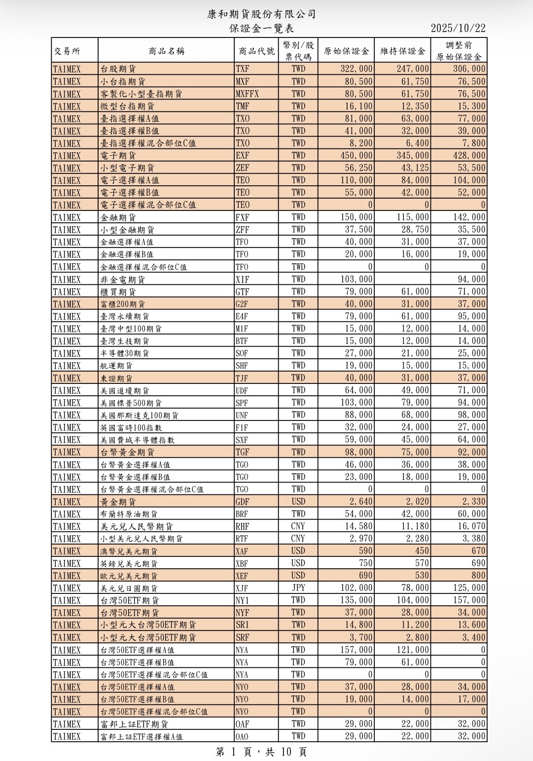 臺灣期貨交易所於114年10月22日公告調整臺股期貨契約(TX)、小型臺指期貨契約(MTX)、客製化小型臺指期貨契約(MXFFX)、微型臺指期貨契約(TMF)、電子期貨契約(TE)、小型電子期貨契約(ZEF)、富櫃200期貨契約(G2F)、東證期貨契約(TJF)、澳幣兌美元期貨契約(XAF)、歐元兌美元期貨契約(XEF)、黃金期貨契約(GDF)、臺幣黃金期貨契約(TGF)、元大台灣50ETF期貨契約(NYF)、小型元大台灣50ETF期貨契約(SRF及SR1)、臺指選擇權契約(TXO)、電子選擇權契約(TEO)及元大台灣50ETF選擇權契約(NYO)之期貨契約保證金及選擇權契約風險保證金(A值)、風險保證金最低值(B值)、混合部位風險保證金(C值)所有月份保證金金額,並自114年10月23日一般交易時段結束後起實施。 期交所提醒期貨交易人,期貨交易為保證金交易,須隨時關切自身未沖銷部位的風險,瞭解保證金風險涵蓋程度,並注意與期貨商約定的風險控管措施,交易人應提高風險意識,多加注意帳戶部位及權益數可能變化,適時繳存充裕之保證金,較能避免市場價格劇烈波動產生之虧損超過自身可承擔能力之情事發生,以維護自身交易安全。 10/23 (四) 早盤收盤後調整 大台原始保證金調為 → 322,000 小台原始保證金調為 → 80,500 微台原始保證金調為 → 16,100