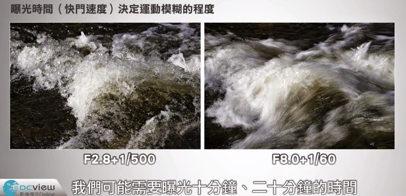 大致做了筆記 光圈影響是景深... 小光圈- 主角和背景都是清楚的, 大光圈- 背景是模糊的,稱為散景 光圈數值越大, 實際開的孔徑越小 一般而言, 大光圈用在拍人像, 暗處或室內使用 快門 - 主要影響畫面的動態, 畫面是瞬間凝結還是有流動的感覺 基本上是快門簾開啟和關閉的時間, 就是喀到嚓的時間啦! 高速快門用於拍攝動態瞬間, 像寵物, 小孩, 運動中的生物, 一般用 1/100~1/200 秒的快門 慢速快門用於流動的主題, 如溪瀑, 車軌, 星軌 安全快門- 當人不動, 拍攝物不動時, 速度可在 1/60 秒以上, 當拍攝物為運動物體, 則可提高快門至 1/100 或 1/200 秒以上 看到是上篇, 當然很努力找下篇囉! 因為這樣的初階又有系統的說明, 真是符合我現在的需求, 發現它是 DCView 數位影像的線上教學, youtube 上只分享上篇, 其它課程則需登入會員, 才能觀看! DCView 是個熱鬧的網站, 內容太多了, 以前逛到這網站, 總不知如何下手, 看看就走了, 原來它也有線上課程可學習, 今天看到的分享是免費課程, 攝影基礎線上輕鬆學 - 18個主題中的第3主題 http://school.dcview.com/course.php?id=15 不過是要登入會員才能觀賞的, 無法分享, 影片內容真得不錯, 只是播放很不流暢, 看得有點痛苦, 共有 18 單元, 有興趣朋友, 不妨自己進去看看!! 我做做做簡單筆記! 不同等級的相機差異在於感光元件的大小和操控的彈性 感光元件的大小(ccd/CMOS)-影響畫面在高ISO的畫質 操控的彈性-可達到景深,溪流, 車軌等效果