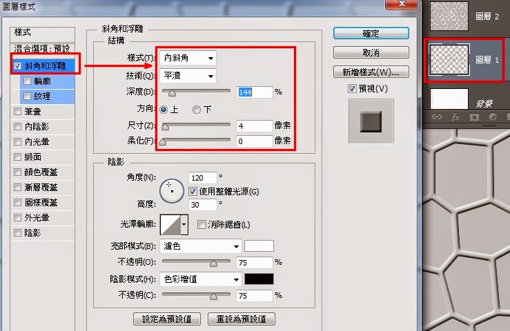 2、切換至色板面板中,點擊建立新色板 - Alpha 1。 5、回到圖層面板, a. 新增圖層1, b. 前景色設定 - 灰色 6、a. 新增圖層2, b. 反轉選取 7、Ctrl+D取消選區。 8、圖層1 設定 a. 執行 增加圖層樣式 - 斜面和浮雕 設定參考值如圖 b. 點擊紋理二下, 進入設定面板 a. 增加圖層樣式 - 斜面和浮雕 斜面和浮雕是應用很廣的好用功能 當設定為外斜角時, 又看到不同風景囉, 像凹了下去般 快樂吧, 這麼輕鬆愉快就能變換想要的牆面... b. 可以和圖層1 一樣, 設定紋理 就能得到最上方結果 這裡我用 內斜角, 不設紋理 改用 顏色覆蓋來設定磁磚顏色 c. 另外也可用圖樣覆蓋來設定喜歡的建材哦! 有興趣的朋友, 可以開始動工砌牆囉!! 收工了, 輕鬆一下.... “我很能吃苦” 這五個字,我做到了前四個,也就是說我已經達到了80% |