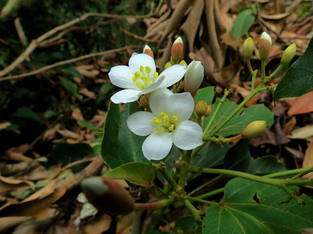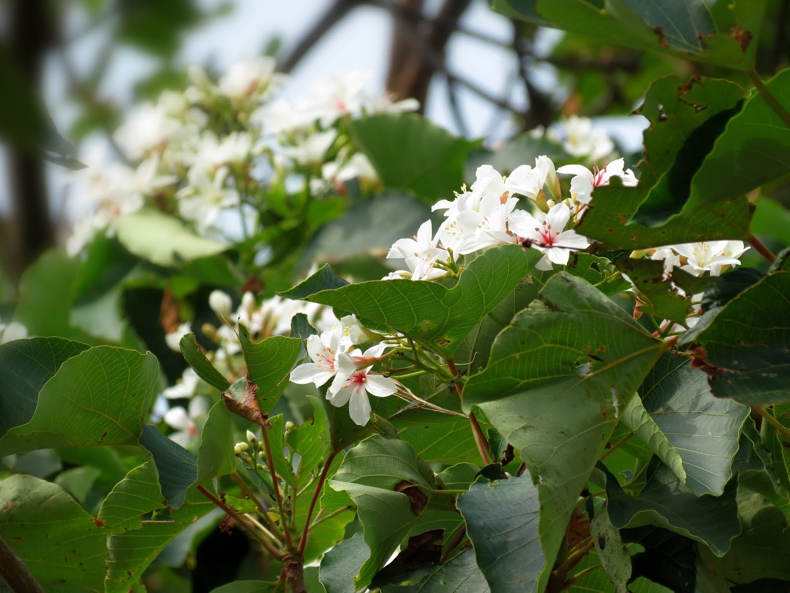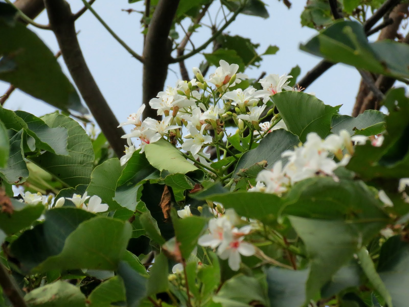 這這...這... 油桐花怎麼和某個政黨一樣亂了套... 這時候, 不該它上台呀! 9月底時在運動的路上, Pete Pan 問我, 兩旁樹上的花苞是什麼? 我瞄了一眼, 告訴他: 油桐花啦! 然後自己大笑, 再說: "我孤陋寡聞, 這種花型, 我只認識油桐花..." 不以為意的認為是我不認識的樹種... 這星期-中興有茶葉博覽會的影響, 車潮人潮湧入, 我們改變運動路線, 從鳯山寺走臥龍坡到員林運動公園, 再從藤山步道走回南投, 上一次走這裡是5月油桐花開時, 為了拍花而來, 只是今年花況很不好, 缺水的因素, 油桐葉也都乾乾枯枯, 油桐花也開得二二六六, 無精打采, 只好找"春香"來站台, 撐場面, 下方是今天五月在挑水古道拍的 走著走著, 看著對面山腰處處有群聚白花, 抬頭上看, 發現身旁樹上, 也有些疏疏落落的白花... 非常像油桐花, 我一直向上尋找著, 磨菇了好一陣子, 開心的以為發現新大陸, "這花好像油桐花呀!"