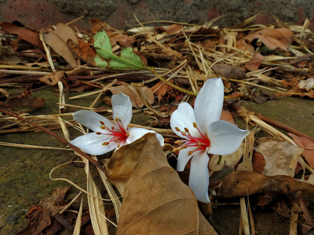 Peter Pan 也告訴我 "對呀! 地上的落花也很像..." 哈哈! 我真是捨近求遠, 一直忙著用相機當望遠鏡, 沒注意到腳邊的落花 開心的徜徉在今天的邂逅中 十月的油桐葉, 杜鵑肆虐後, 有些支離破碎, 但小家碧玉的油桐花, 雖掛在歷盡滄桑的枝頭, 一如5月模樣, 清新可人 乍辭枝頭別恨新 和風和淚舞盈盈, 淒美氣韻交錯的分離與聚合.....