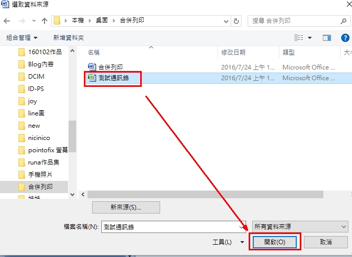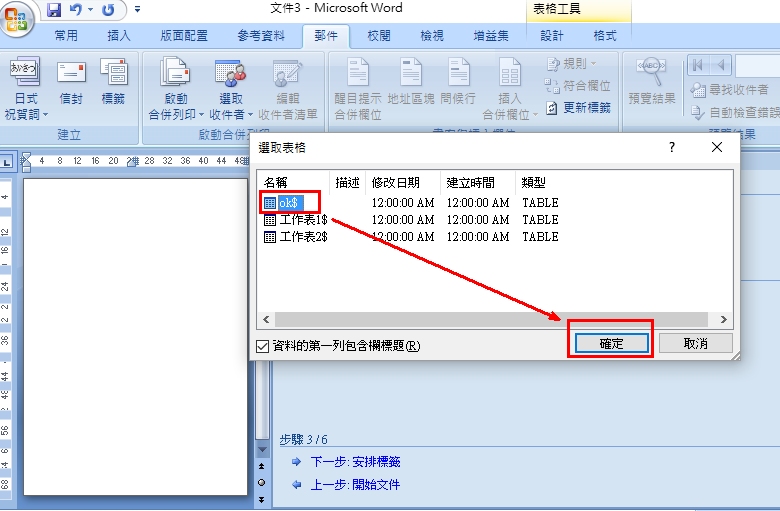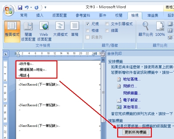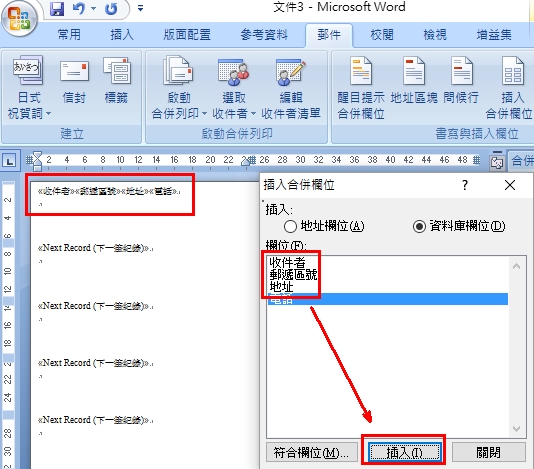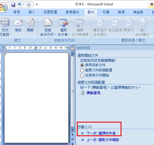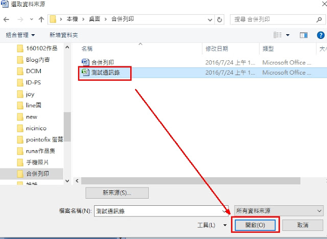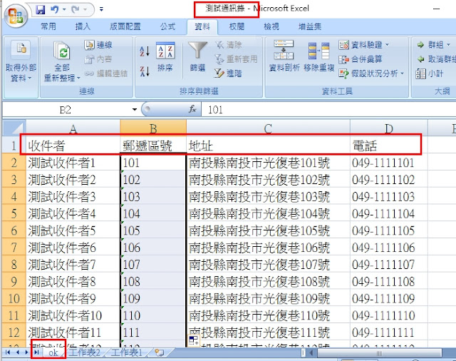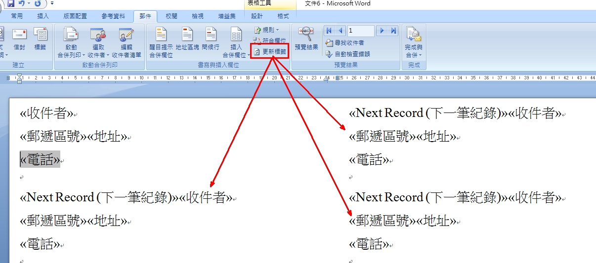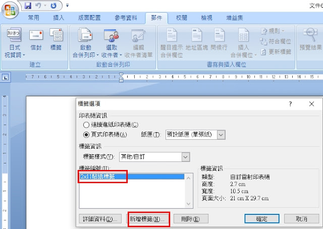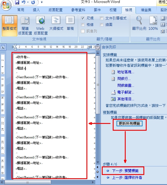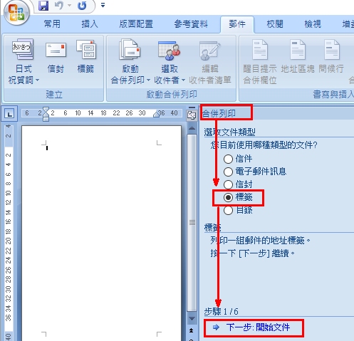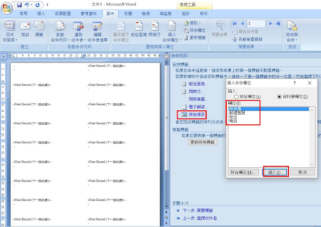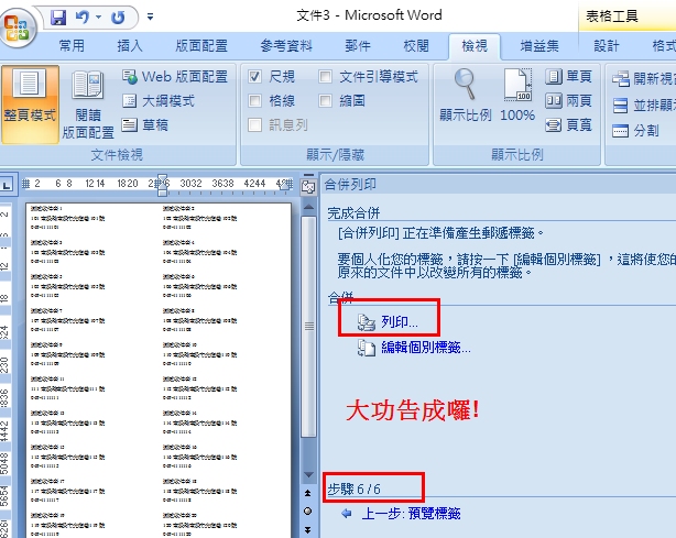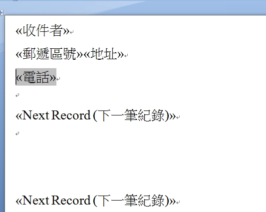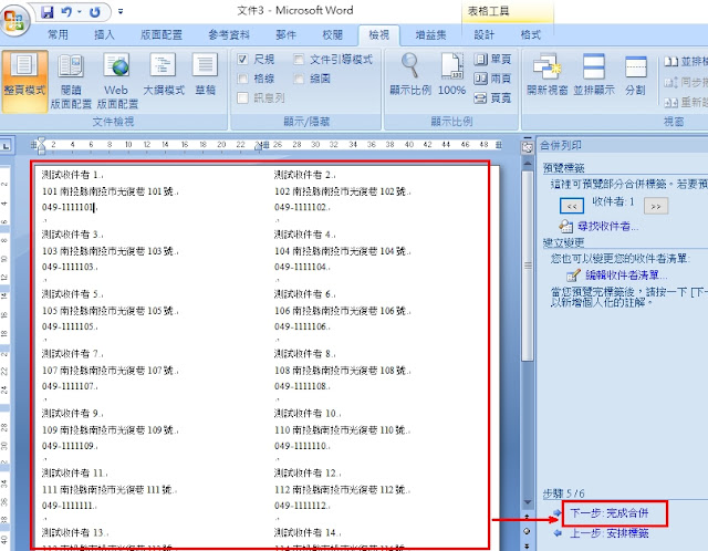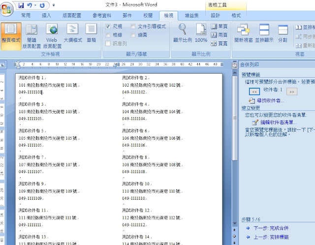 首先, 我們會用 excel 整理好通訊資料 -測試通訊錄 現在開啟word 文件, 這裡使用的是word 是 .docx 今天要示範的是常用的 22格標籤貼紙 1. 先新增一份空白的Word -> 建立 2. 「郵件->啟動合併列印->逐步合併列印精靈」 (對不熟的朋友, 可選擇此項, 幫忙引導) 開啟後, 右側會產生精靈視窗, 引導執行步驟。 開啟的精靈視窗中 步驟 1/6 選擇 "標籤" 類型文件-> 下一步: 開始文件 步驟 2/6. 變更文件版面設置 -> 標籤選項(進入標籤選項視窗) 完成標籤設定後, 進入下一步:選擇收件者 步驟 3/6 選擇現有清單 -> 瀏覽 選擇完成的通訊錄檔案-測試通訊錄, 選擇 - 表格OK, 確定資料後 確認是否為所需資料 WORD 版面會帶入, 所設定的表格變數 進入下一步: 安排標籤 步驟 4/6 安排標籤頁面 其它項目 -> 插入需要列印項目 目前插入 收件者, 郵遞區號, 地址, 電話 調整標籤的位置 如果要將第一筆紀錄的版面配置, 複製到其它, 點擊更新所有標籤 步驟 5/6 預覽標籤 步驟 5/6 預覽無誤時, 就可以進步完成合併 步驟 6/6 列印後, 就大功告成囉!! 當我們熟悉時, 不需用逐步合併列印精靈時, 可以直接在 1. 郵件 -> 啟動合併列印 -> 標籤