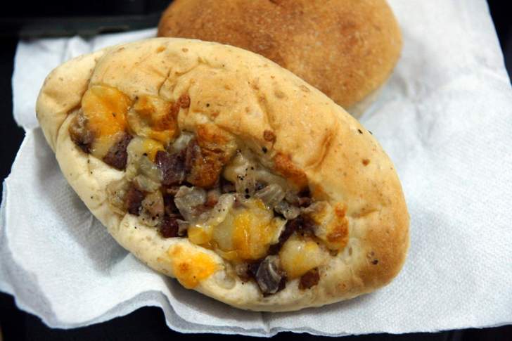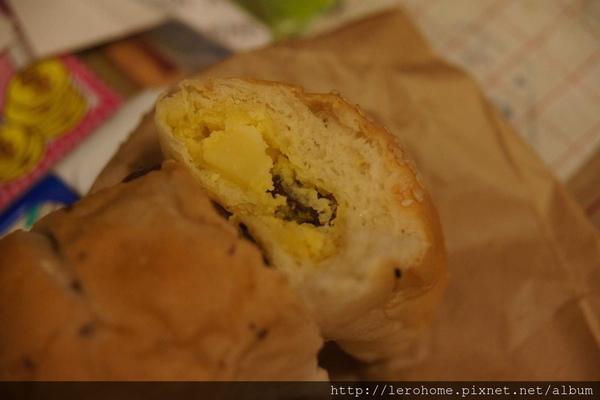上圖是起司洋蔥麵包,麵包很軟Q喔,很有口感, 咬一口看一下內餡如何,有小顆粒的起司塊,麵包還滿扎實的喔!