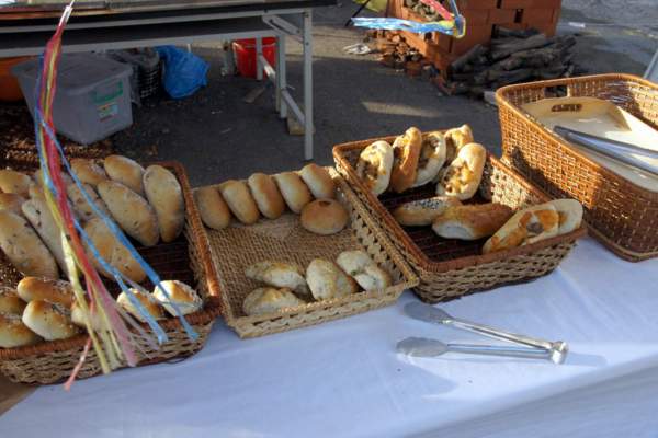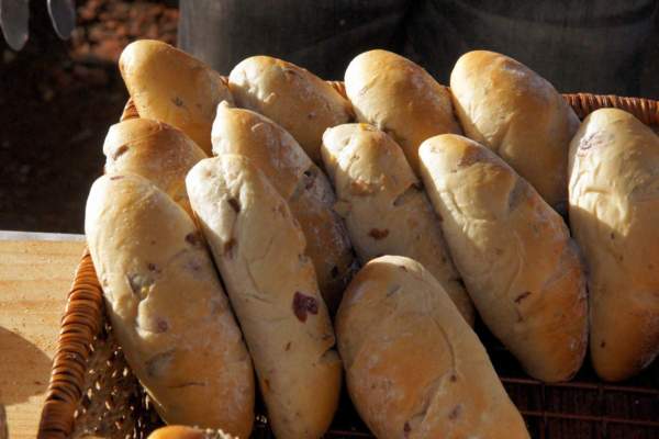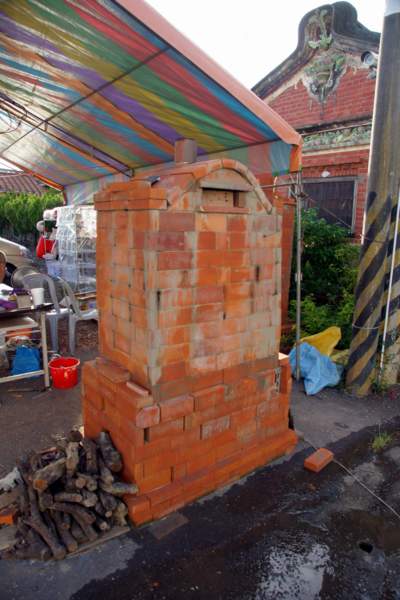位於莊家古厝旁邊,只搭了一個棚子就開始做生意的窯烤麵包,在這地點獨具特色,很有味道喔!買麵包看古厝!上圖就是烤麵包的磚窯,我有看見真的是把麵糰丟進去烤,然後都是用木頭下去燒、加熱,所以麵包才會這樣香吧,老闆說他以前是做磚窯的,後來開始把麵粉放進去窯內烤,發現比烤箱的還香更好吃,所以開始研發了窯烤麵包等產品,非常熱心的一位老闆喔!!接下來看他烤的麵包吧!! 現場就放了幾個籃子,還有窯烤好的麵包,看了就覺得還不錯吃,還滿吸引人的,可能是用料新鮮或是環境無毒,沒加香精,所以老闆還特別放了驅趕的工具在麵包上打轉,這樣做比較好,或是用以前的蚊帳來蓋住麵包也很有特色喔!