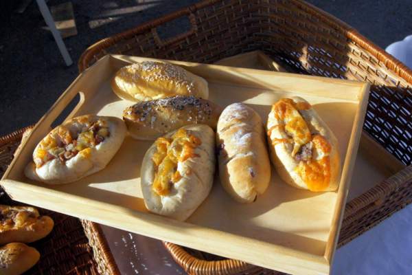 哇~看起來就很好吃了!!老闆說他的麵包真材實料,絕對是很有口感的, 現場我們買了6個200元,共買了五種口味,分別是玉荷包香腸麵包、紅酒桂圓麵包、起司洋蔥麵包、香橙蔓越莓麵包、奶酥麵包,買完後如果沒甚麼人,老闆還會幫忙您跟磚窯一起合照喔!