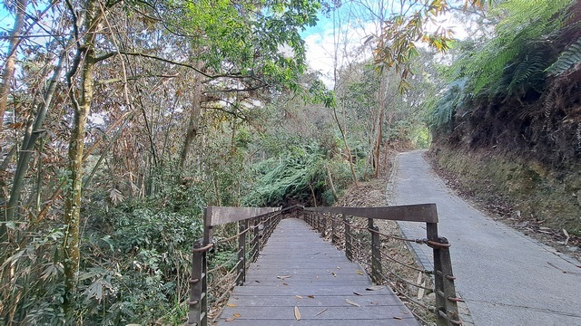 步道並不長,盡頭銜接著雲品溫泉酒店;眼看時間尚早,我們循指標續行至「竹石園」。這是一處靜謐的生態渡假會館,一旁竟隱藏著通往貓囒山的秘徑。即便貓囒山已曾登頂,仍忍不住走上一段,重新感受那份熟悉而幽靜的山林氛圍,才心滿意足地原路折返。