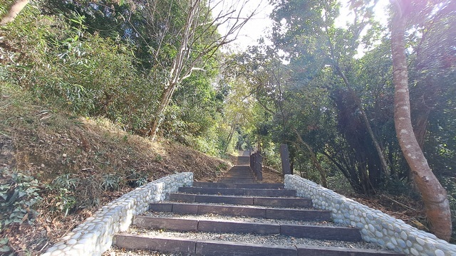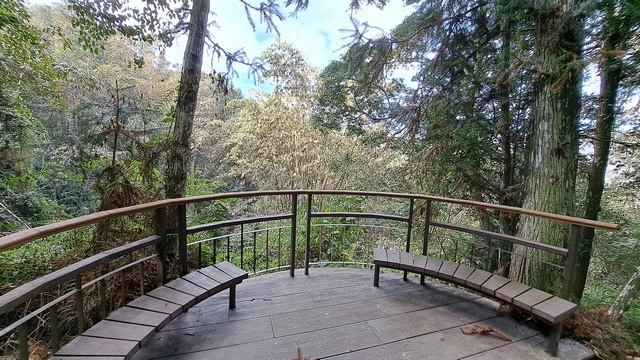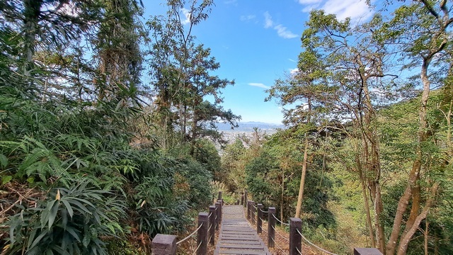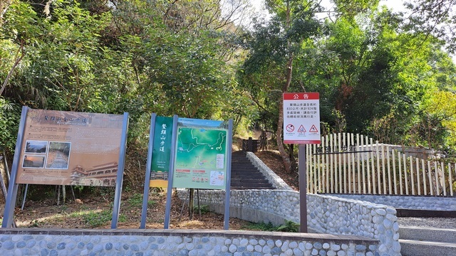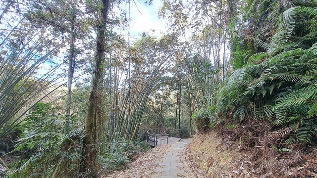 初段路徑是平緩的水泥路,隨後轉入階梯步道。沿途林木蓊鬱、綠意盎然,雖然步道設有觀景台,但視野多被繁茂的樹林遮蔽,難以一窺湖光山色。