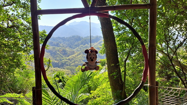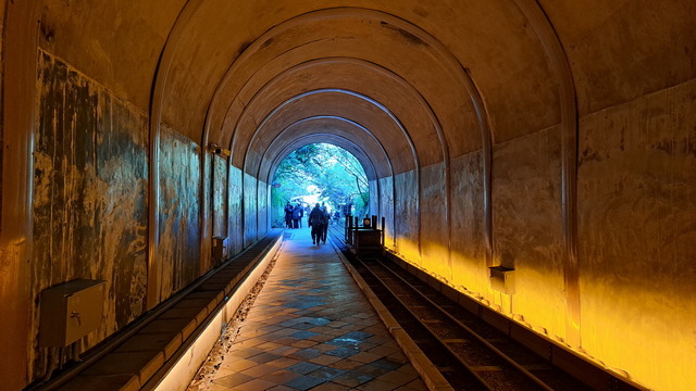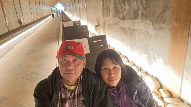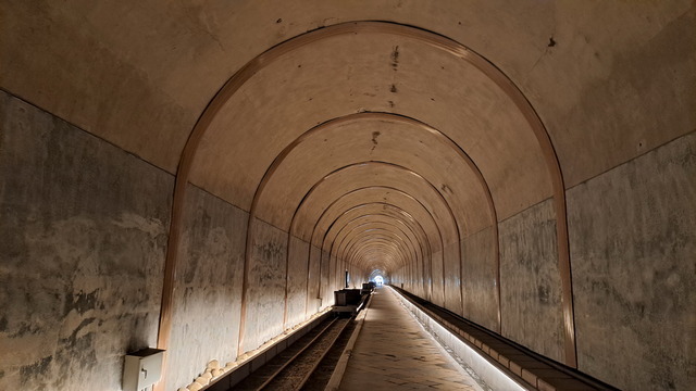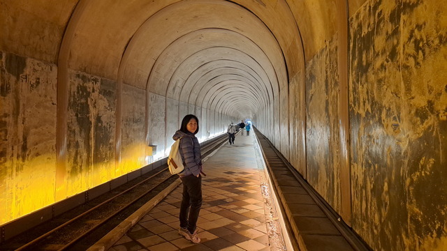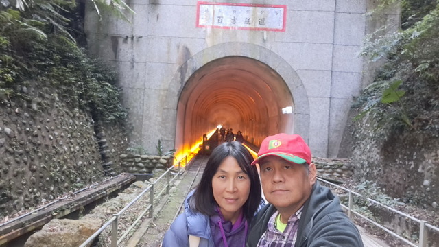 將車停在舊百吉隧道口。這座古老隧道早年是連接角板山的重要路段,為了物資運送還鋪設了台車鐵軌。隧道的迷人之處在於它的「冬暖夏涼」,且走過昏黃的光影密道後,步出出口總有種恍如隔世的錯覺。走入這光影歷史密道,也玩玩遺留下的台車。