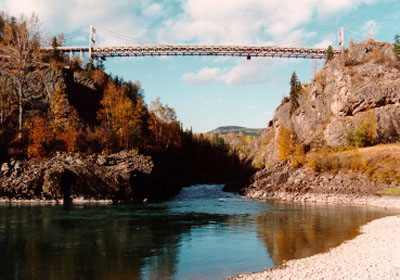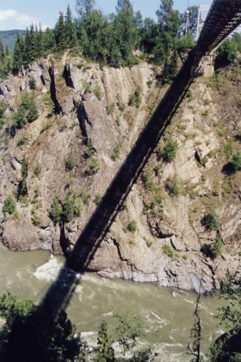 橫跨激流之上,橋下濁流滾滾,是通往老鎮的必經之路。僅容單線通車,車行其上,還真有點膽顫心驚。