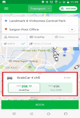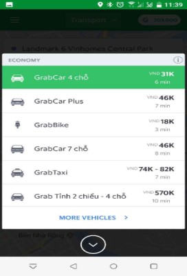 輸入完之後,我們點選下方紅色框框選擇車種。可以選的車型有四人座一般轎車(Grab 4 Chỗ)、高級車(Grab Plus)、計程摩托車(Grab Bike)、七人座休旅車(Grab 7 chỗ)、及外部合作的計程車(Grab Taxi)。一般來說,四人座轎車就已經很夠用了,有大件行李或是人數較多的話才會搭七人座轎車。 另外如果想體驗越南特有的摩托車或是趕時間(市區尖峰時段容易塞車)可以試試看計程摩托車。