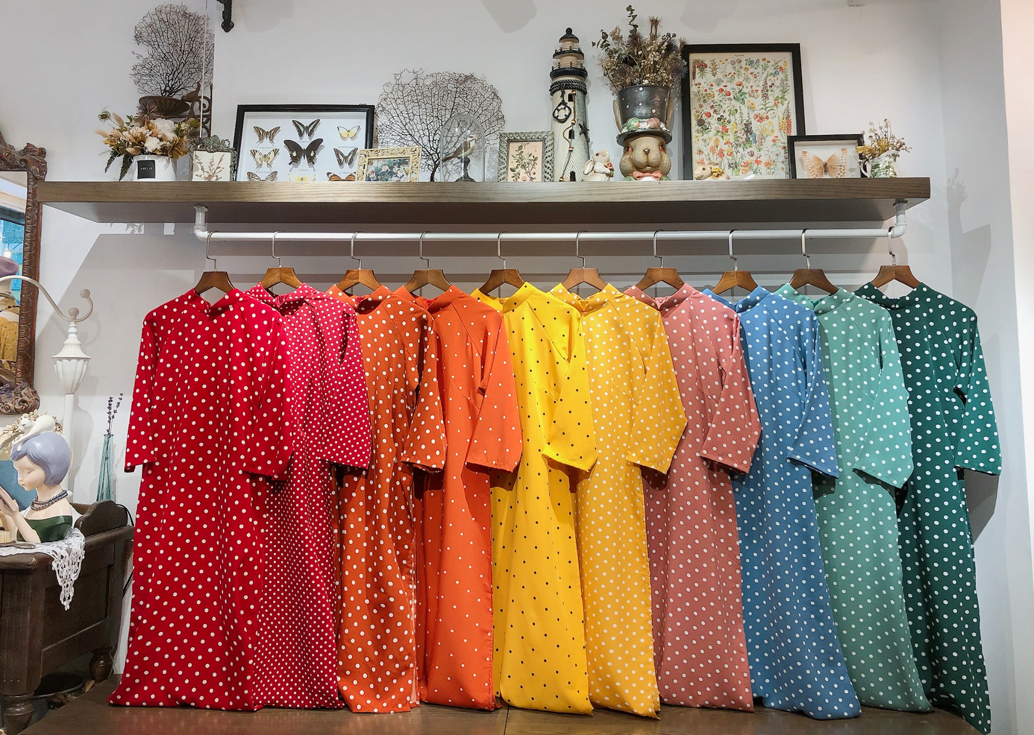第二家 Rosemary.shop 和MONO的新式奧黛相比,Rosemay的奧黛顯得傳統、復古又優雅許多,整家店佈置的很有東西合璧的感覺,所有的衣服按造色彩整齊排列,脱鞋、開門、走進去、就立馬想要拿一件衣服起來奔向試衣間🏃♀️看看穿在自己身上是什麼樣子的感覺~