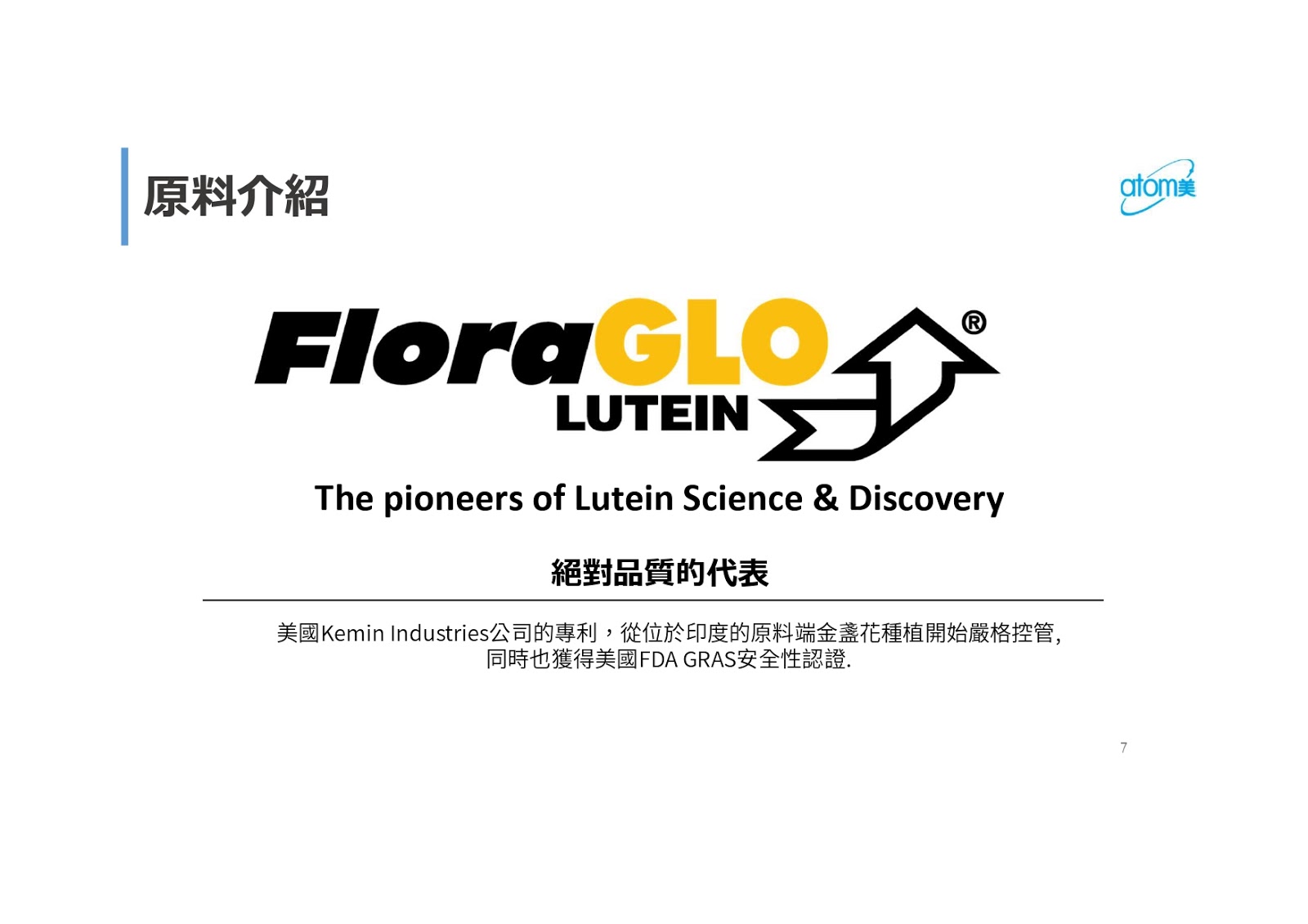 🌻FloraGLO Lutein 全球知名的葉黃素原廠「 Kemin Health,L.C. 」的註冊商標。 🌻國際特殊製法技術 由天然的金盞花抽取出,精製且結晶化的天然素材。 🌻徹底化的栽培管理 只使用來自葉黃素原廠「 Kemin Health,L.C. 」檢定的印度契約農場栽培來的萬壽菊。 🌻多樣的機能性 與含在葉黃素裡的玉米黃素起互相作用來輔助有機的健康保養。