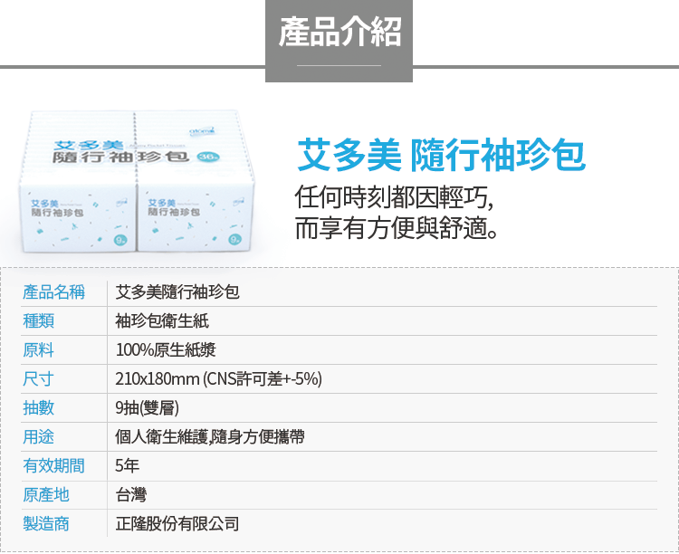 艾多美 隨行袖珍包 一般來說, 市售的小包面紙有隨身攜帶的方便性, 但是因為都用來擦臉, 擦嘴巴, 擦汗水, 所以製作時會加上濕強劑增加他的強韌度, 遇水較不易破, 相對的如果丟馬桶, 就容易造成阻塞了…😯 這時候, 艾多美已經幫您想到了, 要給你更好的選擇 ~😃 艾多美 隨行袖珍包 是可丟入馬桶的衛生紙喔!😮 除了使用FSC認証原生紙漿, 🌲 還嚮應政府政策, 產品可於水中溶解, 維護環境衛生, 🌞 台灣衛生紙製造大廠 - 正隆出品,品質保證,延續台灣優良商品!👍 每次出門時,不要忘記隨身帶個幾包, 自用、分享都是最好的工具喔! 💖 會員優惠價: 72元/36包 平均一包2元 愛乾淨,愛地球的你,艾多美袖珍包衛生紙是你最佳的伴侣! 😍