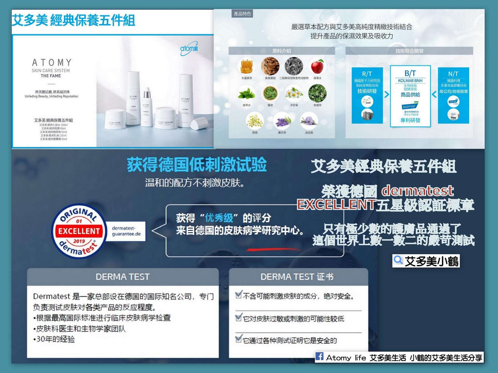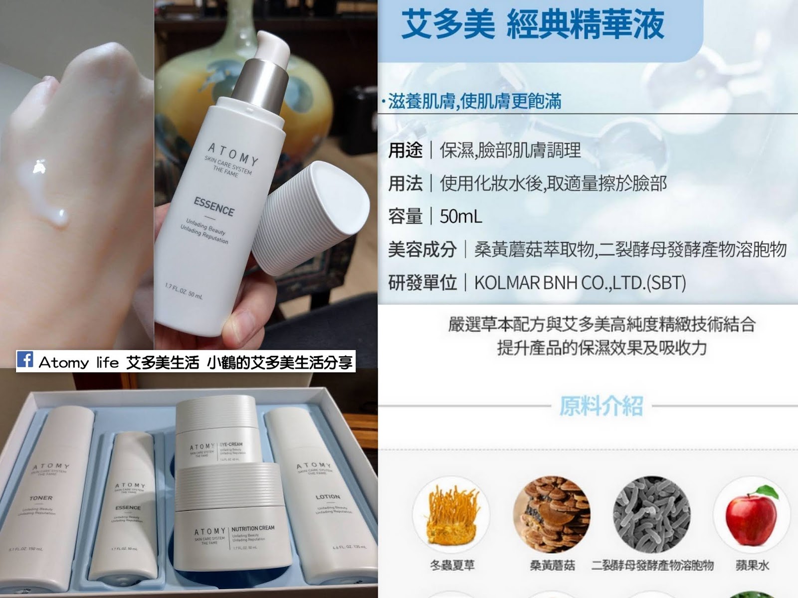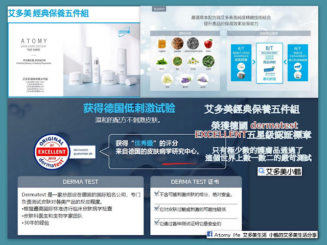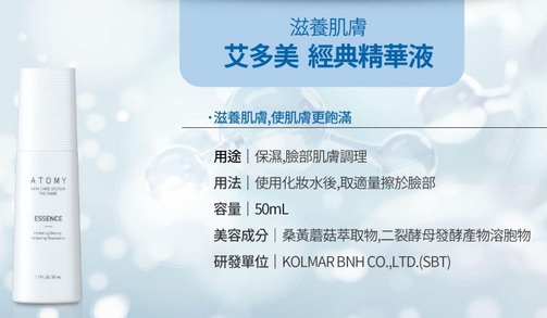 Atomy-艾多美經典保養五件組的 經典精華液 分享篇 最近好好用了艾多美卸妝乳之後, 晚上至少卸2次, 發覺皮膚變緊緻了, 感覺毛孔縮小了😃 接下來就是保養的步驟了, 今天特別要來分享的是經典保養五件組的 經典精華液, 不說不知道, 以前對精華液的感覺是怕怕的, 因為怕太滋養了, 會長痘痘或小粉刺, 所以擦的時候不是很敢用量...🤔 最近開始了解起來他的成分作用之後, 發覺原來艾多美經典精華液的成分之一是大牌護膚品的秘密 ~ 二裂酵母發酵產物溶胞物 ~, 是經雙歧桿菌培養、滅活及分解得到代謝產物、細胞質片段、細胞壁組分及多糖複合體, 其實英文音譯過來就是「比菲德氏菌」...😲 不只如此, 一般保養品包括大品牌產品的第一個成分, 基底液, 通常第一個是水, 成分表中含量比例越高的放在越前面, 而艾多美的精華液的第一個成份是 - 桑黃蘑姑萃取液 ~ 有液體黃金之美稱的保養成分, 不是水喔, 第二個就是二裂酵母...👍 現在每次在塗精華液的時候, 都特別有感, 感覺我在臉上給皮膚吃了益生菌, 特別好吸收, 特別細膩, 把好的吃進去了, 不好的趕出來, 皮膚就特別的Q彈緊緻喔! 😍 其實艾多美的經典保養五件組有 ~ 韓國原子力研究院的高純度精製技術研發 è 科瑪BNH的專利研發 ~ 有生物技術和發酵技術 ,ç 韓國科瑪母公司的多重液晶膠囊技術投資, 是4大技術結合而成的化妝品, 光是原料+技術 本身的研發成本就非常之高, 艾多美專有的保養品背後是世界級的高端技術專利聯合開發的結果喔!👍 艾多美的經典保養五件組, 不靠明星代言、不打各大媒體的廣告, 而是靠會員的親身體驗分享, 把利潤回饋給他的愛用者, 同時, 為了讓消費者使用起來更加安心, 他也做到了化粧品界最高指標的德國Dermatest 的最高級五星低敏認証, 不但用的很安心, 價格也很親民, ❤️ 只有名牌同級品的1/3而已, 讓我可以放心的、好好的、多多的、持續的使用下去, 讓自己越用年輕, 越用越值錢喔!😍 這麼好康的事, 當然要好好分享給大家知道囉! 愛美的妳, 千萬不要錯過喔!🥰 如果你是會員, 請在官網購買, 如果不是, 請跟小鶴連絡!