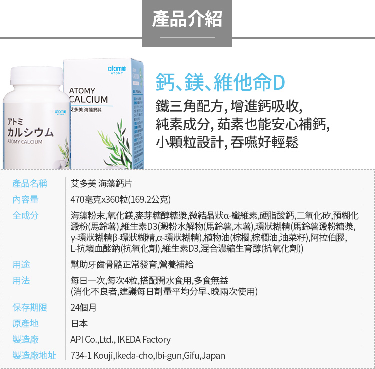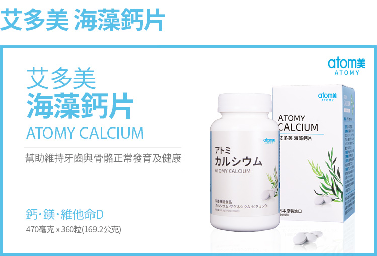 | (Atomy-艾多美海藻鈣片-請點選影片內標題可以在 youtube 觀看) Atomy-艾多美海藻鈣片 台灣新品上市✨ 日本 GSGS產品 🇯🇵 🤔市售的鈣那麼多種, 要如何選? 選擇鈣,要看鈣的來源,安全最重要, 如果能夠天然會更好。 🍀艾多美海藻鈣片的特色🍀 🔴️天然原料來源 艾多美海藻鈣片使用的是來自愛爾蘭的紅藻鈣, 紅藻生長於愛爾蘭沿岸的大西洋純淨海域, 鈣化後的紅藻蘊含多種微量元素及礦物質, 為天然鈣質的優質來源之一。 植物性鈣質,素食者也能安心輕鬆補鈣。 原料資訊: 🔴️鈣+鎂+維他命D:鐵三角配方是維持健康骨骼與牙齒的堅固後盾 👉鈣 有助於維持骨骼與牙齒的正常發育及健康 幫助血液正常的凝固功能 有助於肌肉與心臟的正常收縮及神經的感應性 活化凝血酶元轉變為凝血酶, 幫助血液Ca凝固, 調控細胞的通透性。 👉鎂 幫助骨骼與牙齒的正常發育 維持醣類的正常代謝 有助於心臟、肌肉及神經的正常功能 有助於身體正常代謝 👉維生素D3 增進鈣吸收 幫助骨骼與牙齒的生長發育 促進釋放骨鈣, 以維持血鈣平衡 有助於維持神經、肌肉的正常生理。 三種營養素的協同作用,讓鈣質吸收更完整! ❤️鈣鎂黃金2:1比例 鈣 2:鎂 1 👉鈣400毫克 👉鎂200毫克 同時攝取鈣和鎂, 可產生良好協同增效作用, 有助於維持骨骼與牙齒健康正常發育 ❤️添加維生素D3, 增進鈣質吸收, 促進釋放骨鈣, 以維持血鈣平衡, 有助於維持神經、肌肉的正常生理。 ❤️直徑0.9cm(不到1公分)的小顆粒設計, 方便食用好吞嚥,補鈣輕鬆不卡卡 艾多美海藻鈣片,1080元/360顆/瓶, 4顆/天, 一個月只要360元, 一天只要12元喔, 這麼天然, 這麼便宜, 為了自己和家人的健康, 別忘了天天補充鈣喔! p.s. 市售鈣的種類: (資訊來自網路, 僅供參考)