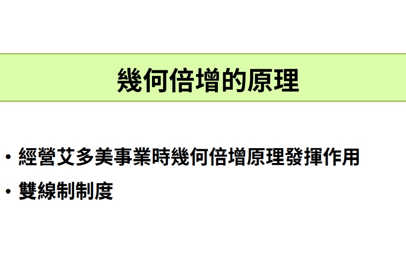 | 艾多美制度是幾何倍增原理, 只有艾多美才能充分發揮效果 因為設有無限階段, 整個世界是一個組織!!!🌏👨👩👧👧👍 ~李聖淵博士 但是對乘除法卻很生疏✖️ 舉一個例子來說吧 曾經有一位青年👨⚕️ 對一位吝嗇社長說 “你只要給我一點薪水就可以”💲 今天給我1美分,明天給我2美分 後天給我4美分” ... 那位社長想一想覺得只要 給他一點錢就可以打發他