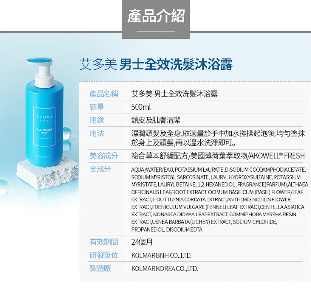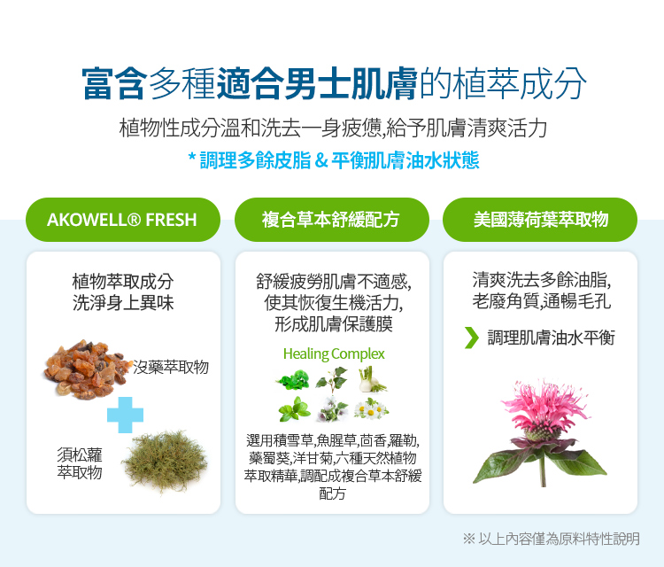 🌿Akowell Fresh 沒藥, 須松蘿植物萃取,去除異味汗臭問題 🤦♂️輕鬆去除髮膠、髮油、髮蠟、定型噴霧等 🌿美國薄荷葉萃取物, 調理肌膚油水平衡 🌿積雪草, 魚腥草, 茴香, 羅勒, 藥薥葵, 洋甘菊等複合草本舒緩配方 🌴椰子油萃取的界面活性劑, 不傷皮膚, 滑順不乾澀 🍊來自義大利香水的柑橘香氣,放鬆心情,舒緩壓力