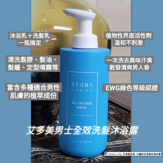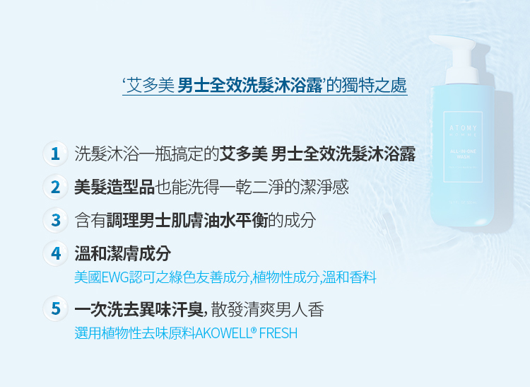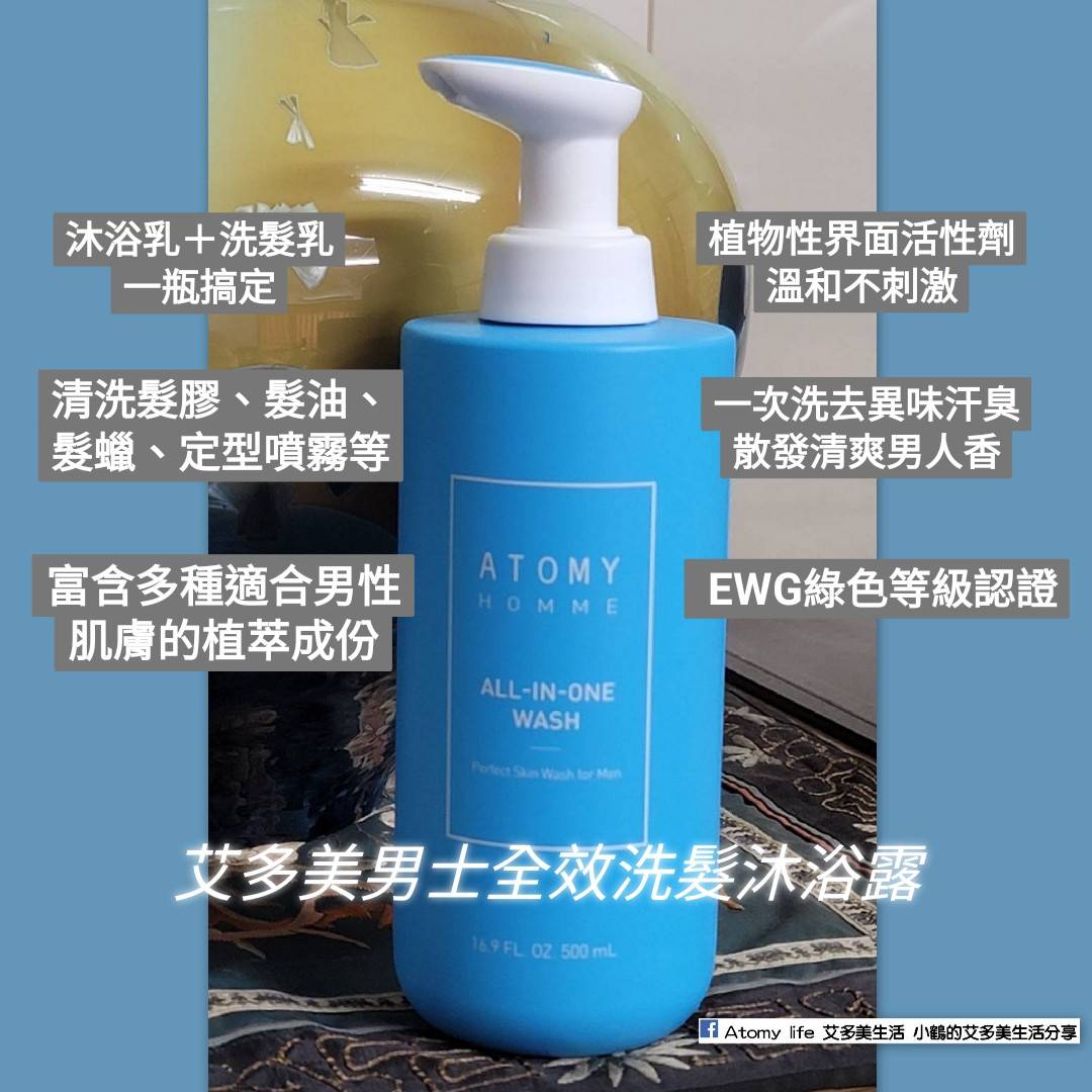 | 男士們就愛簡單俐落, 一瓶迅速洗淨全身上下, 🛀從頭到腳, 即使是難搞的美髮造型品, 只需一瓶搞定, 還給肌膚暢快呼吸温和成分, 一次平衡皮脂控油調理, 洗完滑順不黏膩, 迷人特殊的香氣, 連女人都無法抗拒!😍 Atomy HOMME All-In-One wash 男士全效洗髮沐浴露 🌳EWG認可之綠色友善成分
