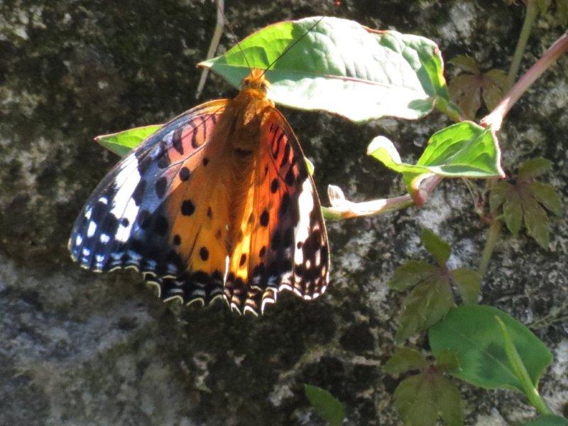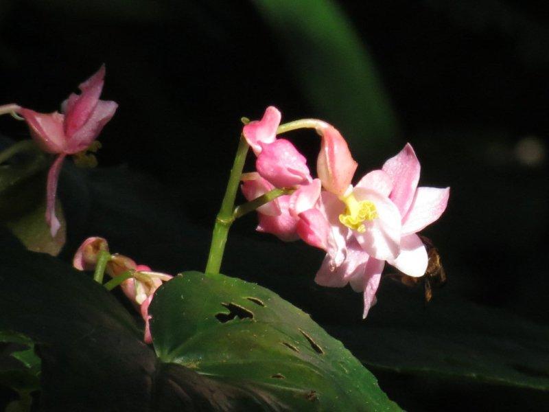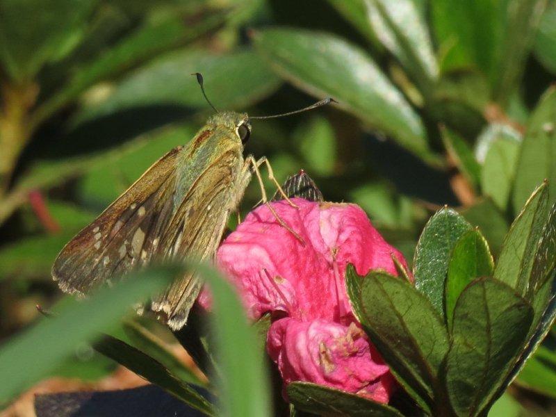 一下車就看到了杜鵑葉上的弄蝶和草坪上的黑端豹斑蝶。走到步道往回看,藍天豔陽,停放的車子閃著亮光,綠葉片耀著白光,光線下的水鴨腳秋海棠更是亮麗。