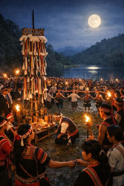 〈Fireflies, Fly On:The Nanzhuang Ri A-Guai Anti-Japanese Uprising〉4 by Chen Ching-Yang Chapter Nine: The Pas-ta’ai (Dwarf Spirit Festival) at Xiangtian Lake This year’s Pas-ta’ai, the Dwarf Spirit Festival, was held on an expanded scale—known as the Grand Festival. The greatest distinction between the Grand Festival and the regular Pas-ta’ai lay in the making of the ritual banner (Sinatun). The ceremonial grounds were set at Xiangtian Lake, and the festival took place on the night of the full moon around the fifteenth day of the tenth lunar month. As early as a month beforehand, the Saisiyat people of Lianxing Village began rehearsing sacred ritual songs that were normally forbidden to sing. One after another, households prepared their surroundings, tying knots of cogon grass—symbols of exorcism—around homes and ritual objects. Two weeks later, the Pas-ta’ai officially commenced. Tribes from near and far responded to the invitation, sending warriors and young women to participate. The ceremonial grounds at Xiangtian Lake became a sea of people—no fewer than four or five thousand—creating a scene both magnificent and awe-inspiring. Officials from the Zhunan District Civil Affairs Office and representatives of Mitsui & Co. were also invited to attend. The second day, Pa’sau (Entertaining the Spirits), formed the core of the entire festival. At dawn, Chief Ri A-guai performed the ritual first, followed by the elders of other clans, since the Ri family bore the responsibility of signaling the spirits with arrows. On the evening of the third day, the people gathered again at the ceremonial grounds, expressing reverence for the dwarf spirits through song and dance. The ritual began with the Kilaki—hip bells symbolizing the dwarf spirits—leading villagers hand in hand into the dance. Eventually, the Kilaki blended into the crowd, dancing among them. At midnight, when the most sorrowful chant, Walowalon—which likens the drowning of the dwarfs to the tragic tale of the Thunder Maiden—was sung, all sounds and movements ceased. Everyone faced east as the chief officiant stood atop a stone mortar, praying and admonishing the people. In past years, the following days were marked by continuous singing and dancing through the night to commemorate the dwarfs. On the morning of the fourth day, a series of martial performances took place. The opening performance was the Warrior Dance. Armed with bamboo swords and spears, rattan armor, and shields, a contingent of sixty-four Atayal warriors from the Lukang community entered the field. Bare-chested, their banded tattoos exposed, they slashed and thrust to the beat of the drums, moving with fierce vigor, sweat pouring down their bodies—an embodiment of strength and beauty. Their formations merged and separated according to the principles of the Five Elements and Eight Trigrams, a system taught by Old Master Lin in the arts of strategic formation. To the untrained eye, it was mere spectacle; only those versed in the art could grasp the subtle transformations and latent power within the shifting ranks. As the drums quickened, the warriors formed groups of three, rolling backward and flipping into spheres, advancing while tossing weapons to one another and changing positions with precision. The audience watched in rapture, erupting into thunderous applause. The Japanese officials and Mitsui representatives, however, frowned in silence, clearly shaken by the disciplined movements and intimidating presence of the unit. When the drums stopped abruptly, the warriors sprang to their feet, sheathed their blades in reverse grip, and stood motionless. Applause roared across the grounds. In the guest seating, all but the shrewd President Miyamoto had turned pale. Apart from Saku Nobuo, none of the Japanese applauded. In the VIP section, President Miyamoto, Manager Ōhashi, Section Chief Itagaki, and Captain Sanbon gathered in hushed conversation. Lowering his voice, Itagaki said, Ōhashi nodded. Captain Sanbon asked, Itagaki continued calmly, Sanbon frowned. “Are you afraid, Captain?” Miyamoto countered. “These people move like ghosts in the mountains. If they revolt, they’ll be far harder to deal with than the Han settlers,” Sanbon replied with a bitter smile. Flicking ash from his cigar, Miyamoto said, Ōhashi asked curiously, Miyamoto inhaled deeply and said gravely, Sanbon nodded. Itagaki asked skeptically, Miyamoto stroked his chin. Ōhashi tried to smooth things over. Miyamoto’s tone hardened. The next performance was the headhunting dance of the Saisiyat Shili-xing community. Forty-nine warriors entered in seven squads, wielding machetes in their right hands and rattan shields in their left, forming the Big Dipper Formation. Though the structure was easy to recognize, its transformations were impossible to discern. Rotations shifted from the ladle’s center to the handle’s tip, then to the star Tianquan, alternating clockwise and counterclockwise—endlessly changing. The warriors danced fiercely, sweat pouring down as the crowd cheered wildly. Saku Nobuo, well trained in Japanese swordsmanship, shouted praise loudly in Chinese—truly a case of “the expert sees the technique, the layman sees the spectacle.” The third performance featured female warriors from the Hakka Erping community, wielding Plum Blossom Twin Swords. The girls formed a three-bud, five-petal formation that shifted rapidly with the drumbeats. Among them was Meilan, her twin blades moving like supple spirit serpents coiling around her fingers—radiant with heroic energy, utterly transformed from her usual gentle demeanor. Nobuo stared in astonishment, forgetting even to applaud. More than a dozen performances followed, presented by communities from Lianxing Village and invited tribes, fully displaying the long-standing martial spirit of the Nanzhuang region. By the end, the Japanese officials and Mitsui representatives felt almost numb, ful