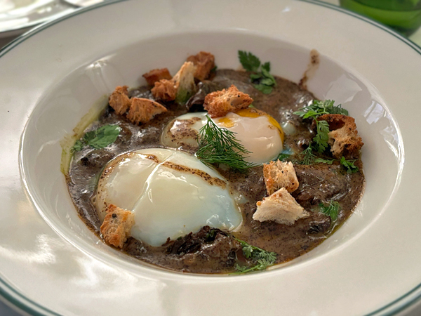 勃艮地區傳統味紅酒水波蛋(Les oeufs en meurette)在台少見,不過當法國菜的市場漸從 Fine dining 改吹起小館風,以後會更易見到?家常菜在此精緻化了,加了當令蕈菇、培根、珍珠洋蔥等,可口。吃著便想起英國名廚 Rick Stein 介紹的白酒版本,有機會要嚐嚐