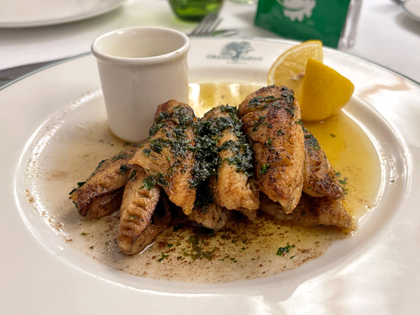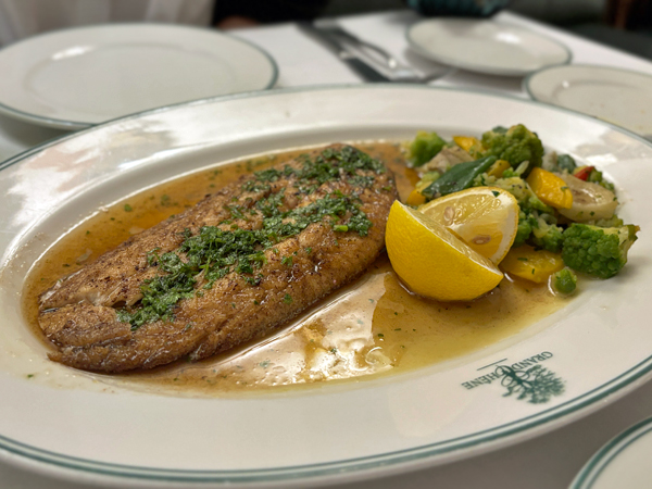 世侄在義大利午餐時便點了 Sole meunière,到瑞士依然想吃,但當天沒有比目魚、換成鱈魚背(Dos de cabillaud);跟先前一樣分了一段來嚐,也好吃