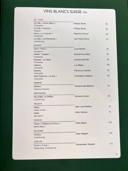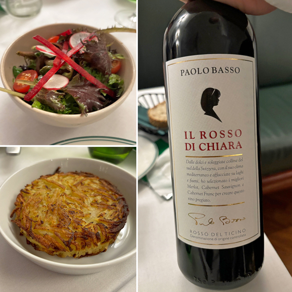 Wine Note: 對瑞士葡萄酒很陌生,在洛桑修習旅館管理四年的世侄對餐飲暸解深入,大力推薦瑞士白酒(見上圖酒單)、果然不失望。於是紅酒繼續在地:2020 Paolo Basso Il Rosso di Chiara’, 產自靠近義大利的 Ticino 區;品種為 Merlot、Cabernet Sauvignon,比例接近法波爾多右岸,但可能因緯度關係、較為輕盈,搭小牛肉真不錯